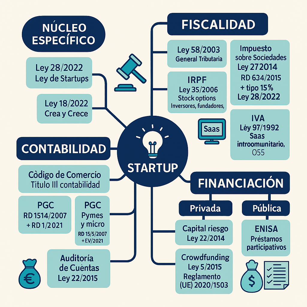 Desde el núcleo específico (Ley de Startups, Ley Crea y Crece) hasta las obligaciones de fiscalidad, contabilidad y financiación. Nosotros te guiamos en cada paso.